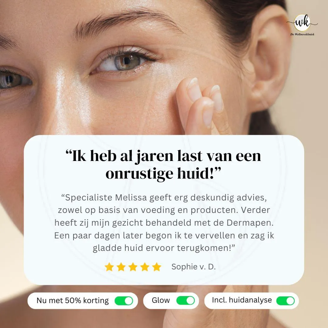 “Ik heb al jaren last van een onrustige huid. Specialiste Melissa geeft erg deskundig advies, zowel op basis van voeding en producten. Verder heeft zij mijn gezicht behandeld met de Dermapen. Je ziet meteen al dat de huid een reactie gaat aanmaken. Een paar dagen later begon ik te vervellen en zag ik gladde huid ervoor terugkomen! Ik blijf zeker terugkomen bij de Wellnesskliniek.”